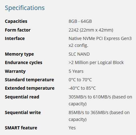 Including PCIe M.2, 3D NAND 2280 and PCIe M.2, SLC NAND 2242 form factor