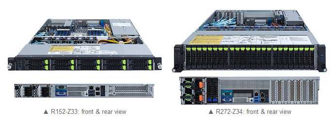 The 1U R152-Z33 and 2U R272-Z34 are designed for single AMD EPYC 7002 series processors with 16 DIMM slots, and up to 4TB DDR4 at 3,200MHz. The 1U R152-Z33 design has a smaller footprint, as the 1U form factor packs in less drive bays, 10×2.5” Gen 4 U.2, for cost savings compared to the R272-Z34 with 24xU.2 and 2×2.5” SATA/SAS bays. As well, both servers have 2xM.2 slots (Gen4 x4) on the motherboard. The R152-Z33 has one full-height half-length PCIe (Gen 4 x16) slot, and the R 272-Z34 has one PCIe (Gen 4 x8) low profile slot. As for networking, both servers come with dual 1GbE LAN ports.