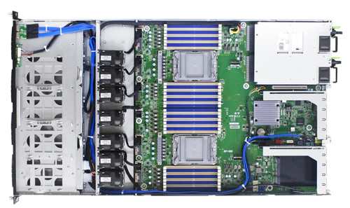 Two 2.5" internal drive trays for OS, one M.2, three PCIe Gen4 x16 add-in cards, with 32 DIMM slots