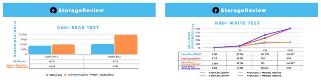 Independent Lab StorageReview.com pulled together a server configured with Optane 200 Series Persistent Memory, Gen 3 Xeon Scalable CPUs, and Memory Machine software from the company. They performed bulk insert and read tests with kdb+, as well as Redis Quick Recovery with ZeroIO snapshot and Redis Clone with ZeroIO snapshot.