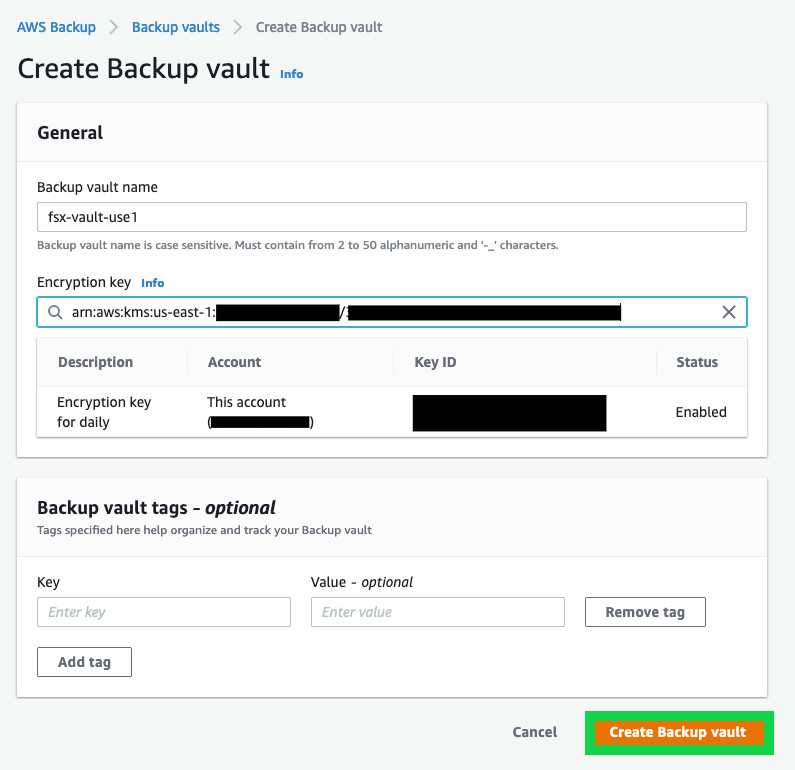 Use an easily identifiable name for the Backup vault name. For encryption, select the customer managed customer master keys (CMK) you created as part of the prerequisites, or an existing customer managed CMK. You can refer to this guide for creation of CMKs in the AWS Key Management Service (AWS KMS) console.