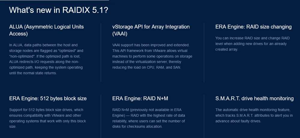With the new features, Raidix 5.1 users will be able to achieve greater system performance and reliability. The implemented technologies shift the load from hosts to storage systems and provide additional customization options in comparison with previous versions of Raidix 5.X.