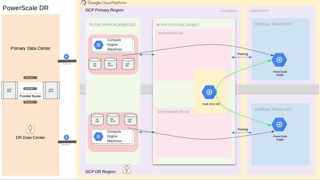 To protect Acme’s PowerScale (Isilon) array, we use Dell EMC Powerscale SyncIQ to replicate data between PowerScale nodes across regions via multi-NICs VM that reside in the primary region but which have a secondary Network Interface (NIC) for the bubble network in the DR region.