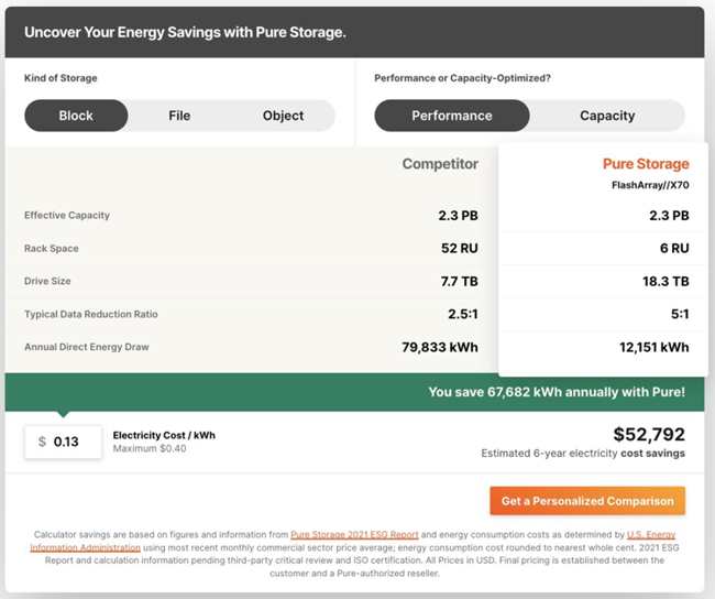 Check out Energy Savings Visualizer, which enables organizations to calculate estimated electricity cost savings based on performance or capacity-optimized block, file, or object storage.