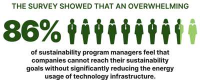 - Technology plays critical, growing role in driving sustainability initiatives: An overwhelming 86% of sustainability program managers agree that companies cannot reach their sustainability goals without reducing their technology infrastructure energy usage. This problem will grow more dire as 81% predict the impact of technology infrastructure on a company’s carbon footprint will increase in the next 12 months.