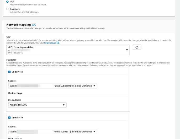c. In Basic configuration, provide a name for the load balancer, and for Scheme choose ‘Internal’. Leave the IP address type as ‘IPv4’. In Network mapping, select the deployment VPC of your file system. For Mappings, select the subnets of the preferred and standby subnets of your file system.