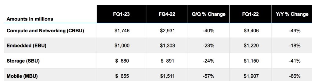 Mobile business unit revenue was $655 million, a low level partly due to the timing of shipments between 1FQ23 and 2FQ23.
