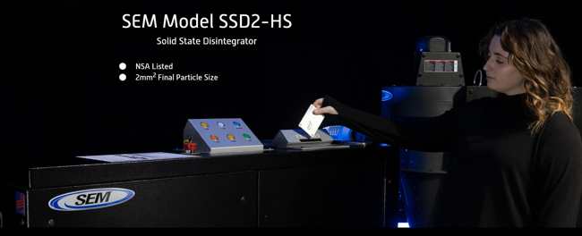“The SEM Model SSD2-HS is an exciting new addition to our long line of disintegrator devices and fills a large void within the intelligence community when it comes to classified SSD destruction,” commented Todd Busic, VP, sales. “This NSA listed device incorporates technologies to mitigate jams and increase operator health and safety via HEPA filters, making the SSD2-HS an industry first.”