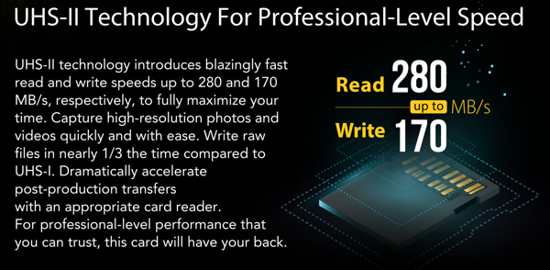 UHS-II technology empowers this card to reach fast speeds. Accelerate your workflow from start to finish in a snap with read speeds up to 280MB/s. Tackle burst-mode photography with ease or record smooth and uninterrupted videos with write speeds up to 170MB/s.
