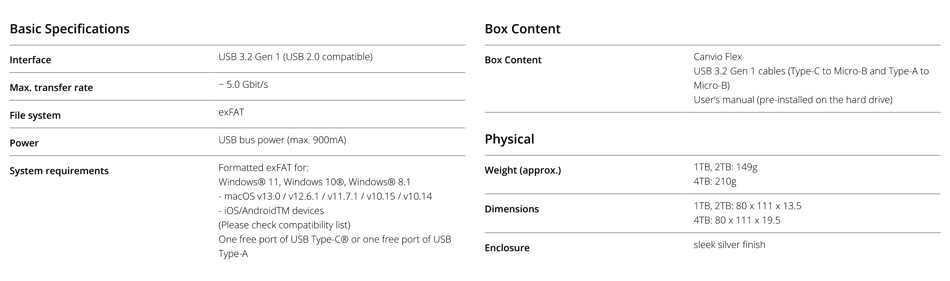 Featuring a slim and lightweight design, the Canvio Flex is available in stylish silver and offers storage flexibility. With transfer speeds of 5Gb/s and capacity up to a maximum of 4TB, it allows user to store and access all the documents need. Preformatted for Macs, Windows PCs, iPad Pro and other USB-C (*) port-compatible tablet devices, it offers instant file sharing from the 1st time of use.