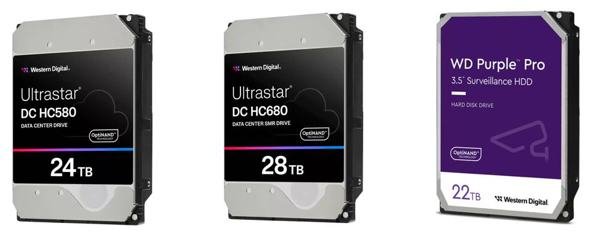 Showcasing 24TB Ultrastar DC HC580 CMR HDD and 28TB Ultrastar DC HC680 SMR HDD, WD Purple and WD Purple Pro HDDs, WD Purple up to 1TB microSD card, and Ultrastar Data60 and Data102 hybrid storage systems