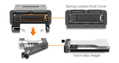 The full-metal removable drive caddy supports hassle-free hot-swapping, reducing downtime during hard drive failures – for time-sensitive projects. It accommodates 5 to 15mm height HDDs or SSDs, creating a versatile 2.5” hot swap bay for any standard SATA/SAS drive. Additionally, the Anti-Dust Flap prevents dust from entering the device when the caddy is not installed, maintaining system cleanliness and functionality.