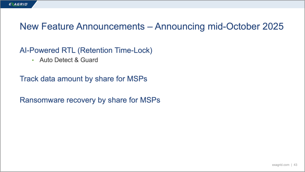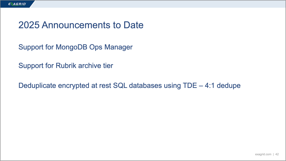 ExaGrid supports more than 25 backup applications and utilities including: Rubrik, Veeam, Commvault, NetBackup, HYCU, Mongo DB, Oracle RMAN direct, SQL Dumps direct and many others. Earlier this year, ExaGrid also announced that it will support Cohesity DataProtect in the first half of 2026.