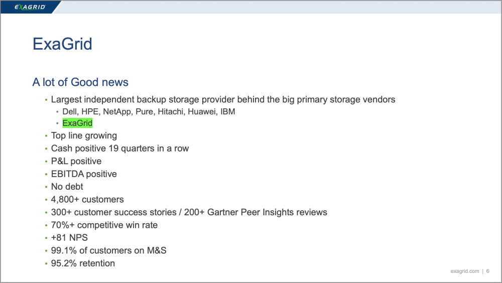 ExaGrid is a financially strong company generating positive cash each quarter and with zero debt of any kind. ExaGrid is the largest independent backup storage vendor in the world.