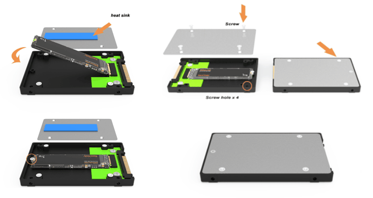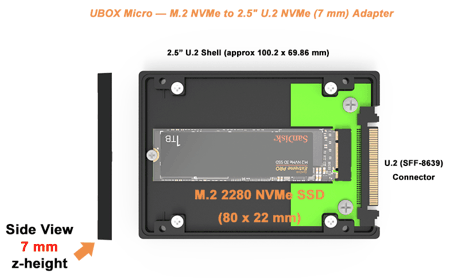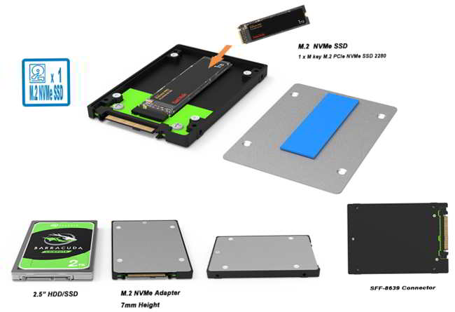 Compliant with U.2 (SFF-8639) specifications and support PCIe x 4 NVMe, transforms standard M.2 2280 NVMe SSD (22x80mm) into 7mm-thick 2.5” U.2 NVMe SSD