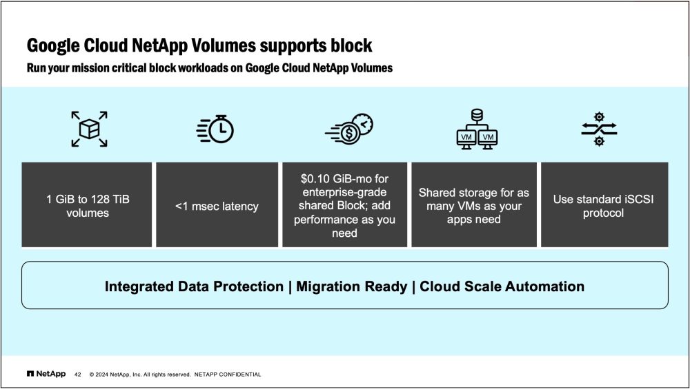 “With the enhancements to Google Cloud NetApp Volumes including the addition of block storage capabilities, we’re giving enterprises more flexibility and power, without added complexity,” said Pravjit Tiwana, SVP and GM, cloud storage and services, NetApp. “These updates represent a significant leap forward. Our customers will benefit from consistent low-latency performance, enhanced data management with features like snapshots and replication, and the operational simplicity of managing both file and block storage from the same NetApp Volumes service.”