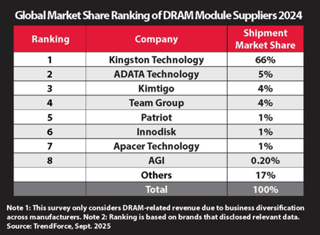 This is a Press Release edited by StorageNewsletter.com on October 16, 2025 at 2:00 pmKingston Technology, Inc. announced it has been ranked top third-party DRAM module supplier in the world, according to the latest rankings by revenue from analyst firm TrendForce Corp.