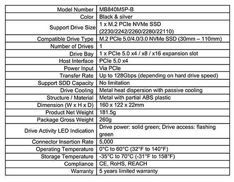 • Fits 1xM.2 PCIe NVMe SSD with all drive length including 2230 (30mm), 2242 (42mm), 2260 (60mm), 2280 (80mm), and 22110 (110mm)