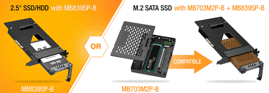 If you are looking to install a 2.5″ SATA SSD through a PCIe slot, the company got you covered! ExpressSlot Elite MB839SP-B is compatible with the PCIe 2.0 slot or above and offers hot-swap ability. Pair it with EZConvert MB703M2P-B M.2 SATA to 2.5″ SATA HDD adapter to swap M.2 SATA SSD and 2.5″ HDD/SSD within the MB839SP-B receiver frame for great compatibility to a variety of drives.