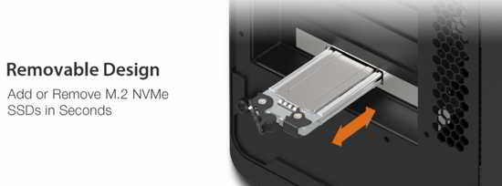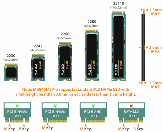 The removable M.2 NVMe SSD tray (MB840TP-B) supports standard M.2 sizes, including 2230, 2242, 2260, 2280, and 22110, ensuring maximum SSD compatibility.