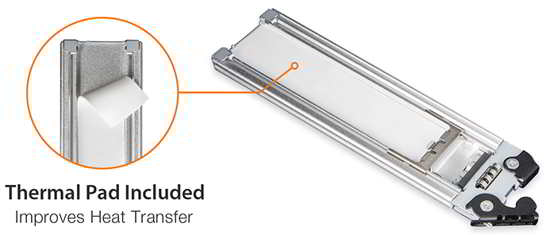 The included thermal pad fills any gaps between the SSD and the metal enclosure, ensuring optimal contact and efficient heat transfer. This design allows airflow to dissipate heat more effectively, maintaining peak SSD performance.