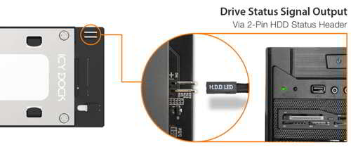 The optional 2-pin HDD activity signal output (cable not included) allows user to transfer the drive activity signal to the computer case or LED panel and lets user monitor the drive activity in the desired location.