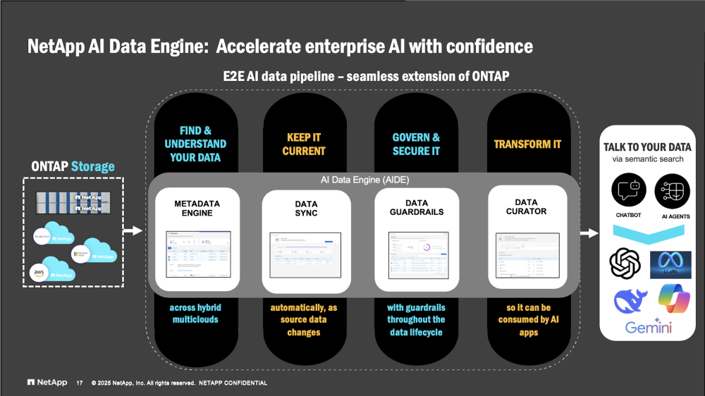 The second key point is related to data quality being an important aspect in the AI outcome. For that, AFX introduced another key dimension named AIDE – AI Data Engine – to offer new way to enrich data with advanced services via specific AI mechanisms. This side compute domain leverages the fast connection and uses Nvidia L4 card within the AFX domain, it is represented by up 10 DX50 nodes in one AFX config. This adds a critical data pipeline feature with cleaning and preparation, semantic search, data vectorization and data guardrails to feed external GPU clusters. Future iteration will integrate Nvidia RTX PRO servers. With AFX, Netapp is back on track in the active storage group aligned to AI challenges and requirements, it was expected following last year new architecture announcements.