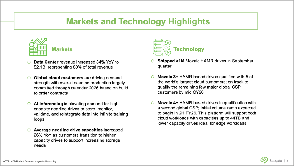 “Seagate delivered strong September quarter results, with revenue growth of 21% year-over-year and non-GAAP EPS exceeding the high end of our guided range. Our performance underscores the team’s strong execution and robust customer demand for our high-capacity storage products,” said Dave Mosley, chair and CEO, Seagate.