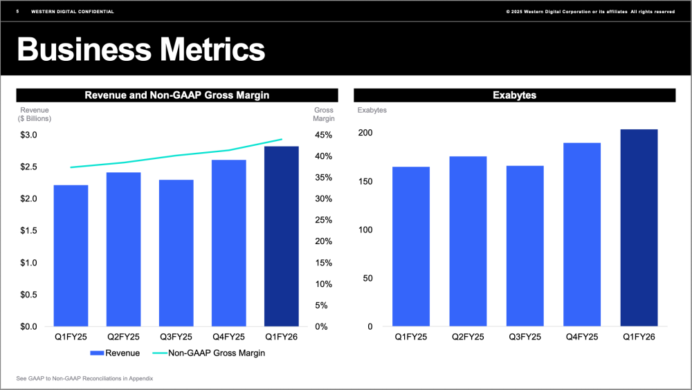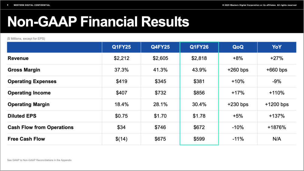 “We expect continued revenue growth driven by data center demand, and improved profitability led by the adoption of our high-capacity drives. For our fiscal second quarter of 2026, at the mid-point of the ranges provided in the table below, we expect revenues of $2.9 billion, non-GAAP gross margin of 44.5%, with non-GAAP EPS of $1.88,” said Kris Sennesael, CFO, Western Digital.