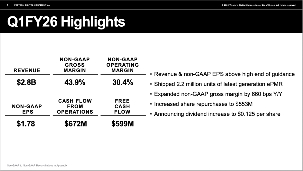 “Western Digital continues to execute well in a strong demand environment driven by growth of data storage in the cloud. In our fiscal first quarter, we achieved revenue and gross margin above the high end of our guidance range, while delivering strong free cash flow,” said Irving Tan, CEO, Western Digital. “As AI accelerates data creation, Western Digital’s continued innovation and operational discipline position us well to capture new opportunities and drive sustained shareholder value. Reflecting confidence in the company’s strong business momentum, the Board of Directors has increased the quarterly cash dividend on the company’s common stock by 25% to $0.125 per share.”