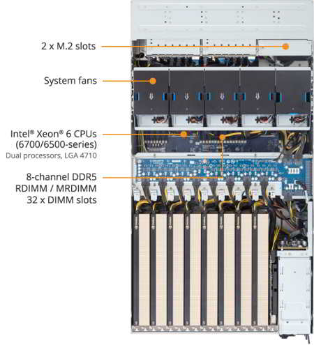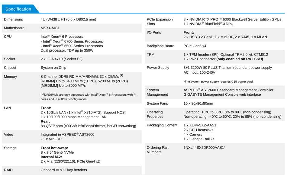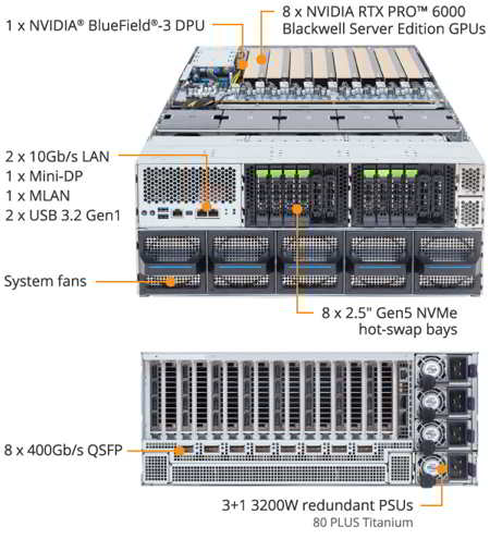 Built on the Nvidia MGX modular reference design, the XL44-SX2-AAS1 supports up to 8 Nvidia RTX PRO 6000 Blackwell Server Edition GPUs for a total of 768GB of GDDR7 memory, delivering throughput for GenAI, 3D rendering, and scientific workloads. Dual Xeon 6700/6500 CPUs, 32x DDR5 DIMMs, and 3+1 redundant 3200W 80 PLUS Titanium power supplies ensure performance and reliability.