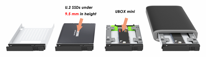 Supports M.2 NVMe (2242/2260/2280) via UBOX mini adapter; remove adapter to use U.2 SSDs (under 9.5 mm height). |