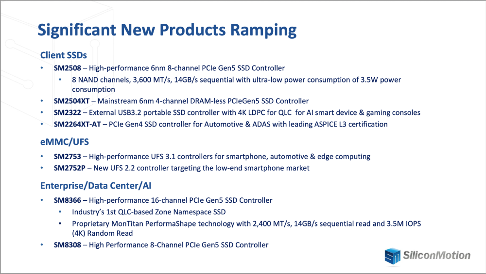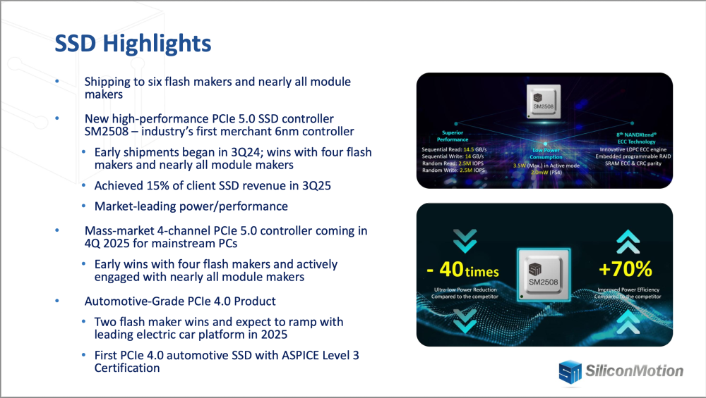 “We experienced better than projected strength across each of our markets in the third quarter of 2025 and delivered revenue well above our previously provided range,” stated Wallace Kou, president and CEO, Silicon Motion. “Our eMMC and UFS products experienced strong growth during the third quarter, primarily driven by a rebounding smartphone market coupled with market share gains. We also experienced continued growth in our automotive segment primarily driven by increased product diversification and new customer ramps. Our leading PCIe5 client SSD controller sales grew 45% quarter-over-quarter as AI-at-the-edge PCs are gaining traction and as white box AI server makers continue to leverage mainstream hardware components. The investments we have made over the past few years are taking root as we are starting to benefit from increased product and market diversification. We believe we are well positioned to achieve long-term, sustainable growth given our expanding product portfolio of leading consumer, enterprise, automotive and industrial storage solutions.”