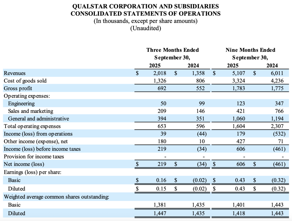 Qualstar Corp., a trusted provider of scalable data storage and high-efficiency power solutions, reported financial results for the third quarter ended September 30, 2025.Qualstar Fiscal 4q24 Financial ResultsThe third quarter of 2025 reflected strong execution and accelerating demand for Qualstar’s tape-storage systems. With no debt, consistent profitability, and growing visibility across global customers and partners, Qualstar is well-positioned to scale both organically and through strategic initiatives as the data-storage industry enters a new era of growth.