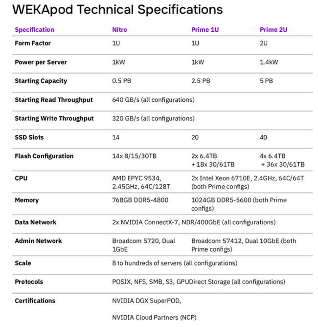 WEKApod Prime: offers a unique approach to mixed-flash technology, intelligently combining TLC and eTLC flash drives in configurations supporting up to 20 drives in a 1U rack or 40 drives in a 2U rack configuration. Unlike traditional tiered storage solutions that introduce cache hierarchies, data movement between tiers, and write performance penalties, WEKApod’s AlloyFlash delivers consistent performance across all operations – including full write performance without throttling – while achieving breakthrough economics. No compromises, no write-performance penalties, no cache hierarchies. WEKApod Prime is already being used by AI cloud pioneers like the Danish Centre for AI Innovation (DCAI).