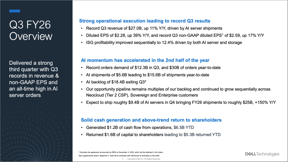 Dell Technologies announced financial results for its fiscal 2026 third quarter and provides guidance for its fiscal 2026 fourth quarter and full year. The company also names David Kennedy its CFO on a permanent basis.“In the third quarter we delivered record Q3 revenue of $27 billion, record Q3 profitability, strong cash generation and above-trend capital return of $1.6 billion,” said David Kennedy, CFO, Dell Technologies. “FY26 will be another record year, and we’re raising our AI shipment guidance to roughly $25 billion, up over 150% year over year, and revenue guidance to $111.7 billion, up 17%.”