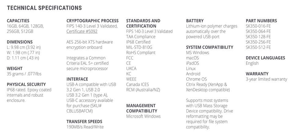 The Sentry K350 stands as the only TAA-compliant, FIPS 140-3 Level 3 Encrypted USB flash drive featuring a status display. Key features include: