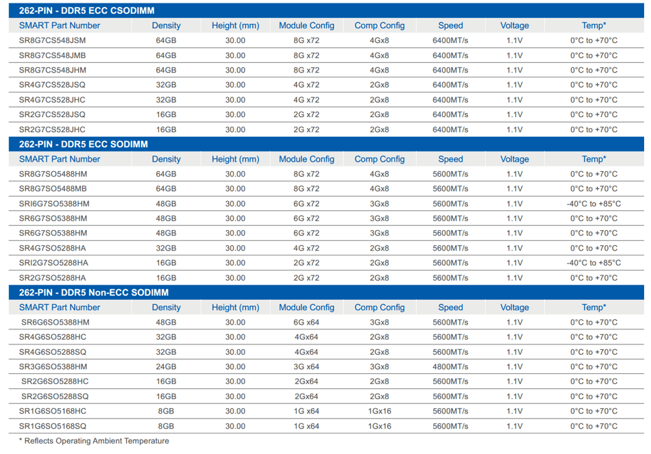 With the introduction of the 64GB capacity point, SMART’s DDR5 SODIMM family now spans 16 to 64GB, including capacities of 16, 32, 48, and now 64GB. This expansion enables system designers to choose the optimal memory density and performance profile for their application needs.