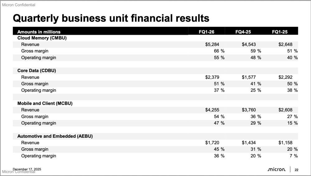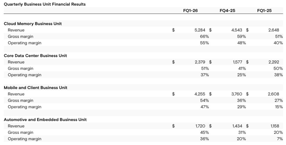 “In fiscal Q1, Micron delivered record revenue and significant margin expansion at the company level and also in each of our business units,” said Sanjay Mehrotra, chairman, president and CEO, Micron Technology. “Our Q2 outlook reflects substantial records across revenue, gross margin, EPS and free cash flow, and we anticipate our business performance to continue strengthening through fiscal 2026. Micron’s technology leadership, differentiated product portfolio, and strong operational execution position us as an essential AI enabler, and we are investing to support our customers’ growing need for memory and storage.”