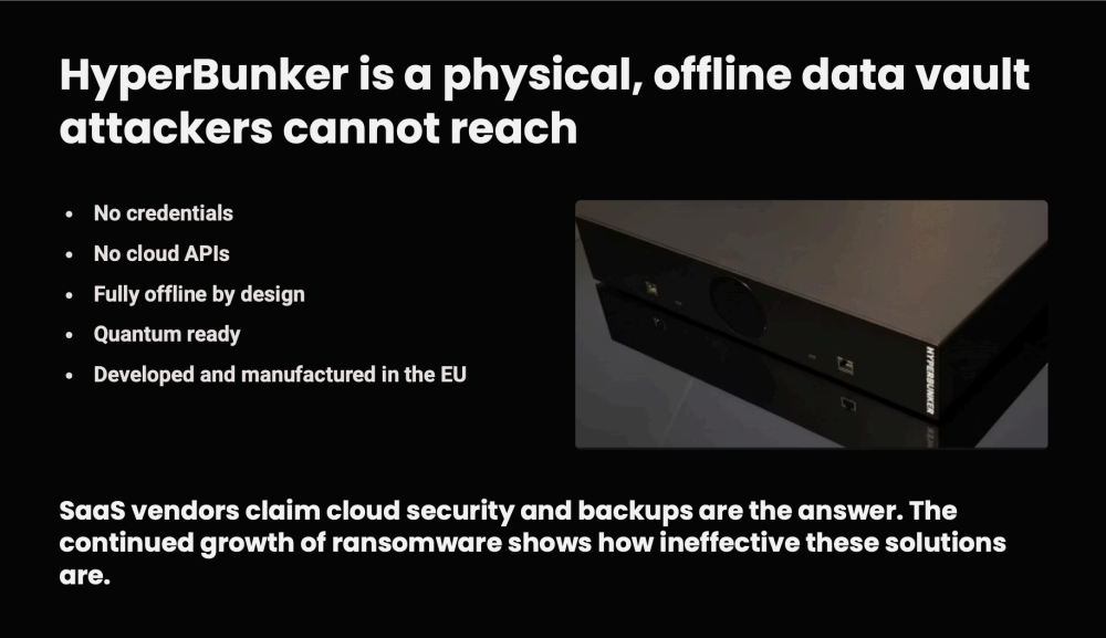 A central claim of the presentation is that “the worst place to protect against ransomware is the cloud.” HyperBunker contrasts its approach with software-defined, credential-based systems that are marketed as “air-gapped” yet remain reachable to attackers. By stripping connectivity out of the equation entirely, the company says its vaults sit beyond the attack surface. If attackers cannot see the data, they cannot encrypt or destroy it.