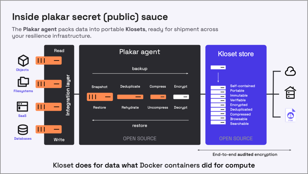 Plakar’s answer is what it calls the “Open Resilience Standard.” At the core is an open-source agent that packages data from virtually any source – filesystems, objects, databases or SaaS – into portable, immutable containers called “Klosets.” These containers are encrypted end-to-end, deduplicated, compressed, verifiable and browsable, and can be stored anywhere: cloud object storage, low-cost NAS, tape or on-premises infrastructure. The key point is separation of trust and service. Data is encrypted before it leaves the customer’s environment, and encryption keys never leave their control. Storage providers, MSPs or cloud platforms can manage retention, replication and SLAs without ever seeing the data itself.