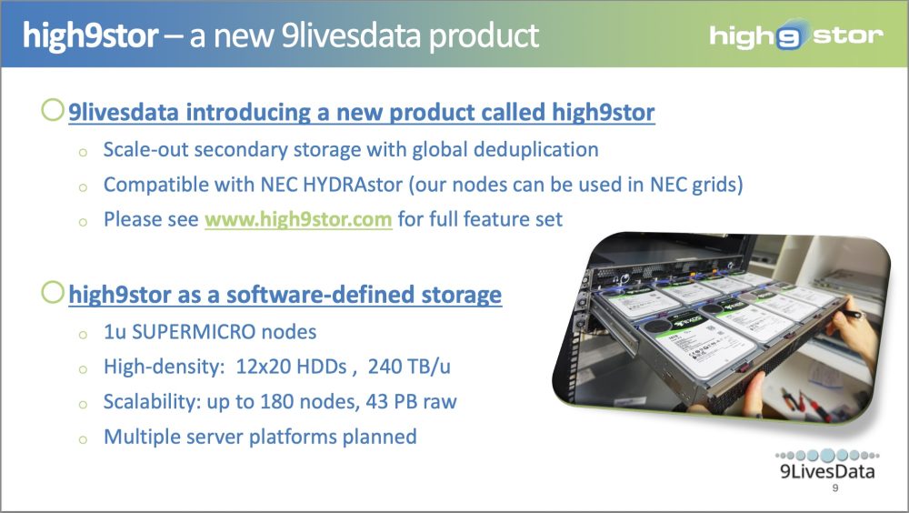 high9stor is positioned squarely in the enterprise secondary storage market, targeting backup and archive use cases where cost efficiency, scalability, and availability matter more than raw performance. The company’s core promise is aggressive total cost of ownership (TCO) reduction – 20% today, with a roadmap toward 30% – achieved through a software-defined, scale-out architecture built on commodity hardware.