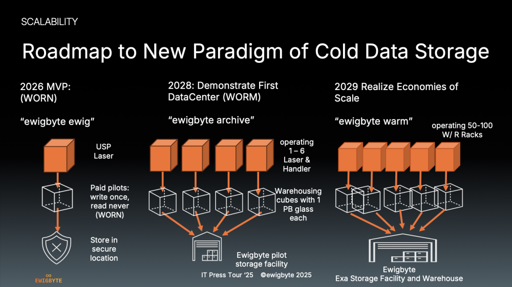 From a market standpoint, ewigbyte sees HDDs and tape steadily losing relevance as SSDs dominate hot data tiers and optical technologies take over cold archives. The company’s go-to-market strategy reflects this transition. Initial deployments target WORN (write once, read never) use cases, such as compliance archives and long-term backups. This evolves toward WORM (write once, read many) archival data centers by 2028, with broader cold and warm data services following as scale and economics improve.