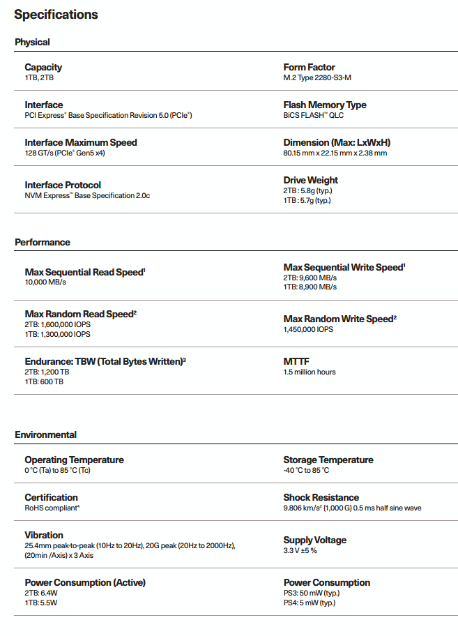 Up to 10,000MB/s and up to 9,600MB/s RW speeds with BiCS FLASH Gen 8 QLC flash memory