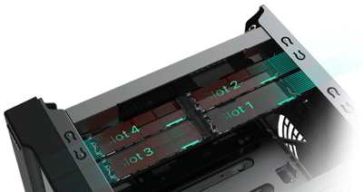 - Dual 5GbE Network Ports: SMB Multi-Channel sequential read/write performance of up to 1,146 MB/s/536 MB/s in RAID-5
