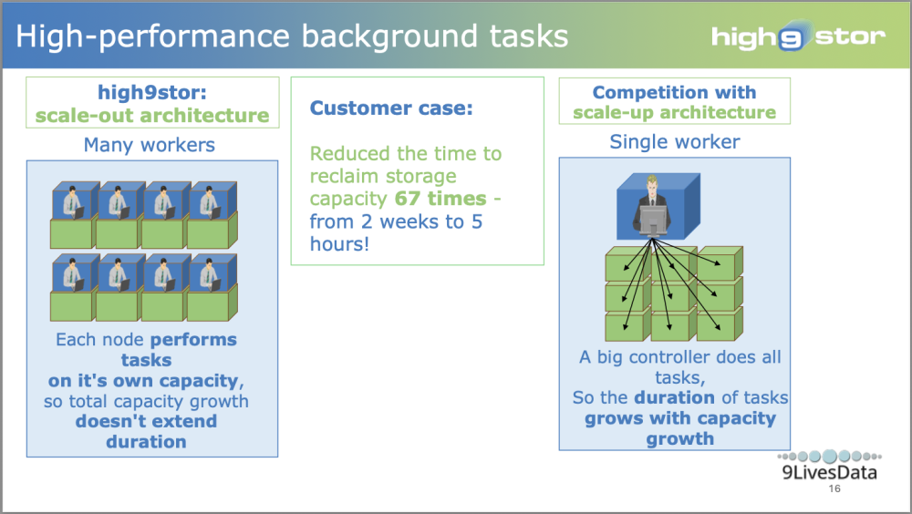 high9stor – scale-out software-defined backup storage with global in-line deduplication. The system currently scales up to 180 nodes and 43 PB raw using 1u Supermicro nodes with 12×20 TB SATA drives resulting in very high 240 TB/u storage density. With dedup on a client backup speed can achieve even 72 PB/h/node; and on restores all disks are used.