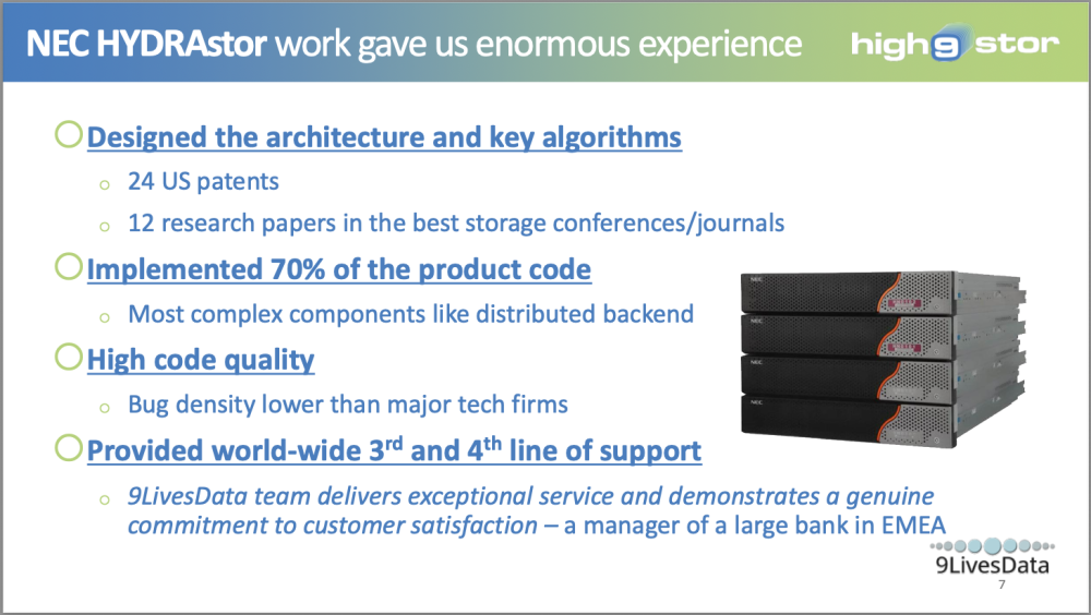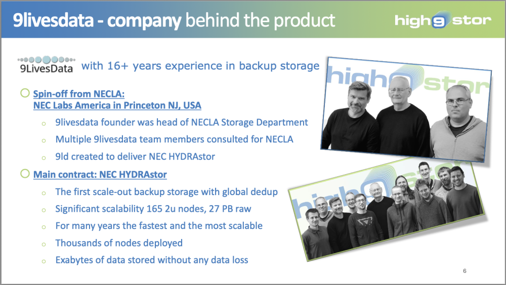 9LivesData was and continues to be an active player in secondary storage with its SDS approach. They built a very respected product for NEC and even developed the data management product promoted by Starfish Software.