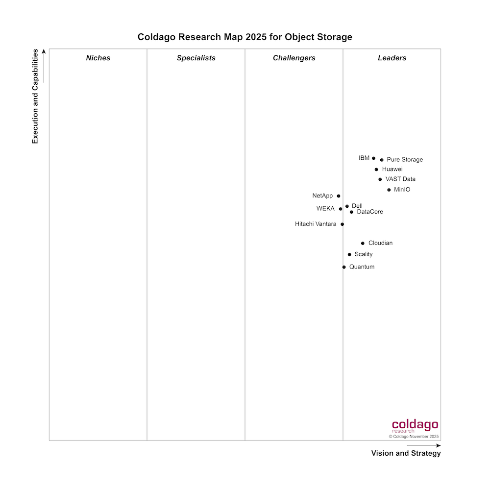 The 2025 edition evaluated 13 vendors and identified 10 market leaders: Cloudian, DataCore, Dell, Huawei, IBM, MinIO, Pure Storage, Quantum, Scality, and VAST Data.