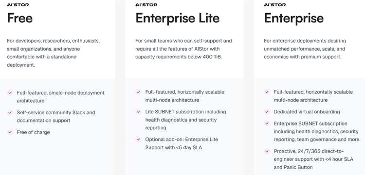 • AIStor Enterprise Lite is designed for smaller production environments and growing teams that require reliability and high availability, but can largely self-support. It offers a practical way to run AI and analytics workloads in production while maintaining control over operational complexity and costs