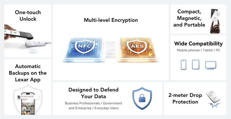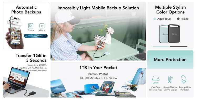 Air Portable SSD – A stylish, ultra-light weight portable storage solution weighting just 0.6 oz, featuring automatic backup via the Lexar App. Designed for creators and mobile users who need fast storage wherever they go